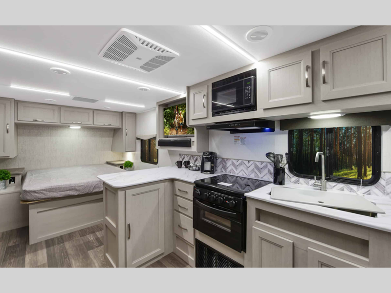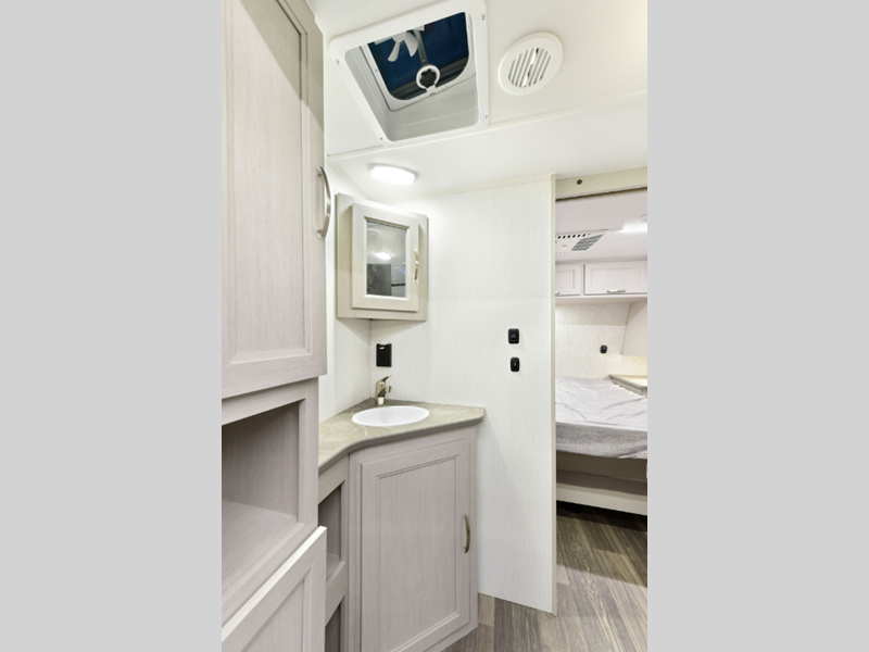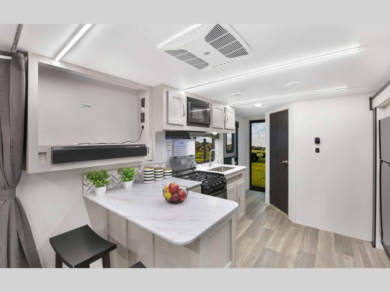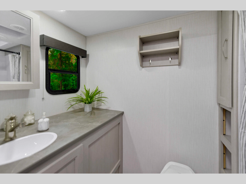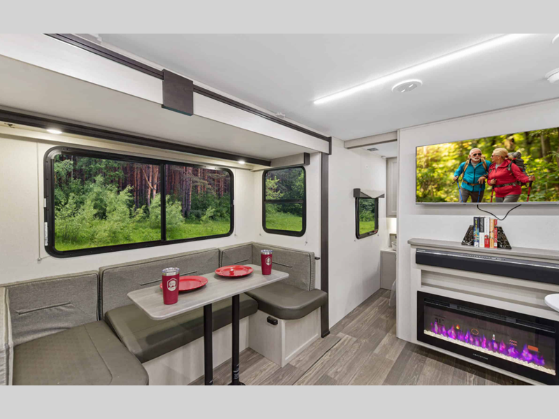 There is over 40 cu. ft. of pass-through storage so you can bring all of the outdoor essentials, and the industry first under-bed pet palace design provides a cozy place for your pet too. The strong foundation consists of a powder coated structural I-beam frame and durable Azdel composite laminated sidewalls. You'll find night shades inside, along with hidden hinges on the cabinetry, multiple 110V and USB outlets, seamless edge kitchen countertops throughout, and many more comforts.