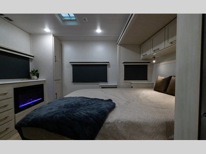 Each model is extended season ready with 12V tank heaters, a sealed underbelly with forced heat and radiant foil insulation, plus Azdel composite walls! The Goodyear tires and tire pressure monitoring system will provide hassle-free towing, and the electric stabilizer jacks make set up a breeze. You'll also appreciate a tankless water heater on board, along with an upgraded slow-close shower door, a central vacuum system, and many more conveniences. It won't be hard to feel right at home with a 5,200 BTU fireplace, custom king bed, Congoleum Carefree linoleum, and residential features!